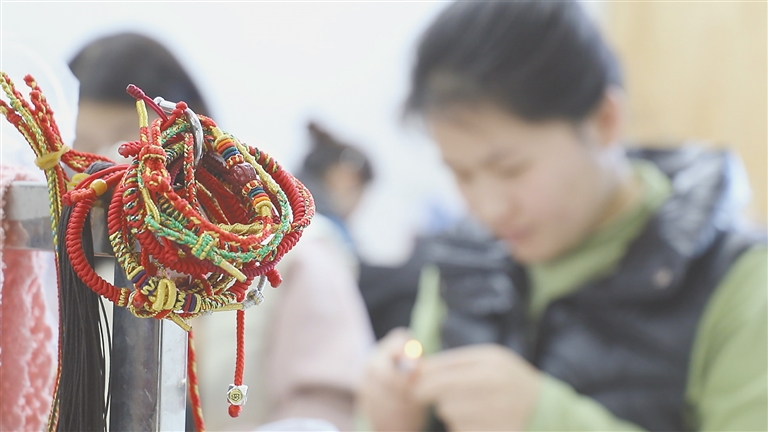 中國結(jié)、紅繩手鏈……喜氣洋洋,年味十足。1月15日,隨著農(nóng)歷龍年臨近,在易縣滿族繩結(jié)編制技藝非遺工坊內(nèi),手工技人們正在趕制“年貨”。巧手翻轉(zhuǎn),五彩絲線在他們的手中不斷跳動,一件件寓意美好的繩結(jié)飾品編制而成。
