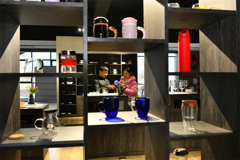 2月11日,客商在河北省河間市一家工藝玻璃制品生產(chǎn)企業(yè)展廳內(nèi)參觀。新華社記者 牟宇 攝