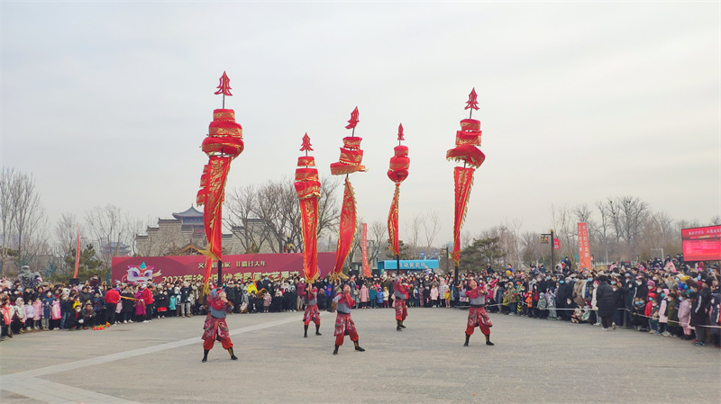 2月2日,登上央視春晚舞臺的雜技中幡表演團隊,在滄州大運河畔演出。河北日報記者 袁 錚攝