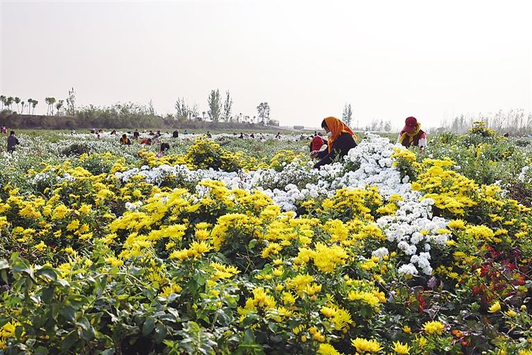 農(nóng)民忙著采收菊花。