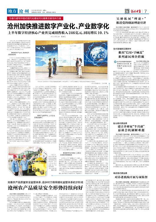 今年以來,滄州市把數(shù)字經(jīng)濟(jì)作為落實(shí)省委、省政府部署要求,推動(dòng)滄州經(jīng)濟(jì)實(shí)現(xiàn)創(chuàng)新驅(qū)動(dòng)和高質(zhì)量發(fā)展的重要途徑,加快推進(jìn)數(shù)字產(chǎn)業(yè)化、產(chǎn)業(yè)數(shù)字化。今年上半年,全市數(shù)字經(jīng)濟(jì)核心產(chǎn)業(yè)共完成銷售收入246億元,同比增長(zhǎng)10.1%。