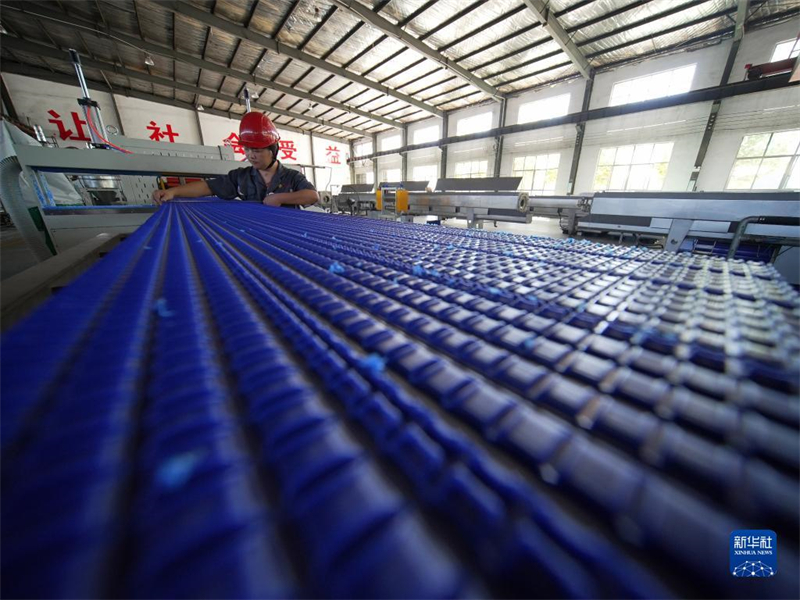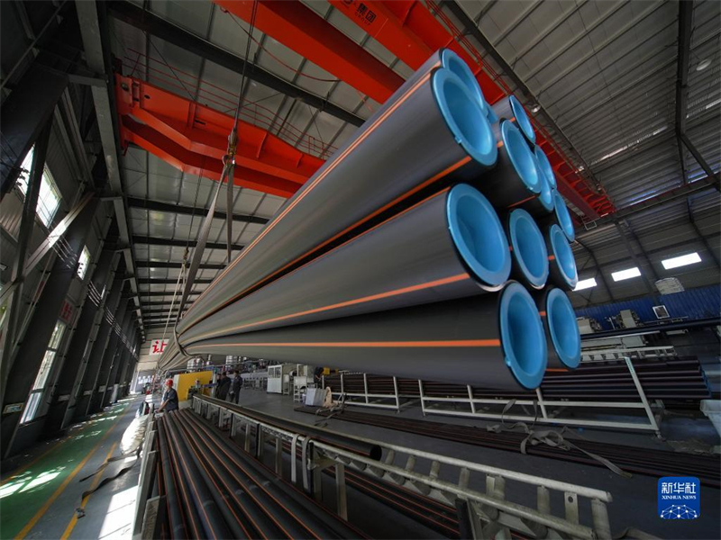 8月22日,工人在河北省滄州市孟村回族自治縣河北一塑管道制造有限責(zé)任公司聚乙烯管材生產(chǎn)車間進(jìn)行聚乙烯燃?xì)夤懿牡跹b。