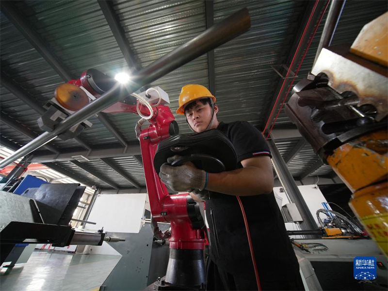8月22日,工人在河北省滄州市孟村回族自治縣河北龍錦管道裝備有限公司生產(chǎn)車間進(jìn)行預(yù)制產(chǎn)品調(diào)試。