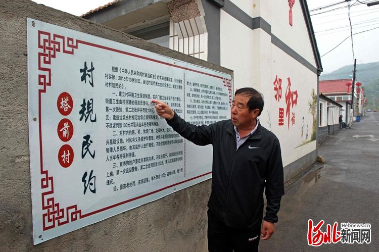 2019年以來,興隆縣通過農(nóng)村人居環(huán)境整治,全域鄉(xiāng)村顏值與日俱增。這是塔前村黨支部書記王長發(fā)在介紹村規(guī)民約。 河北日報記者田明攝