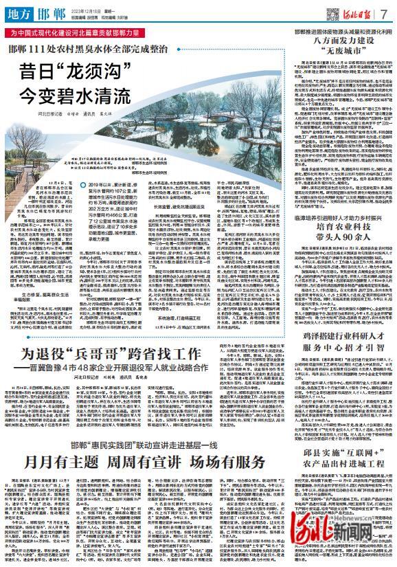 邯鄲市生態(tài)環(huán)境局高級工程師杜韶光介紹,該市綜合采取控源截污、清淤疏浚、水系連通、水生態(tài)修復(fù)等措施,統(tǒng)籌推進(jìn)農(nóng)村黑臭水體、生活污水、垃圾、養(yǎng)殖污水等污染治理,截至11月底,全市111處農(nóng)村黑臭水體全部完成整治。