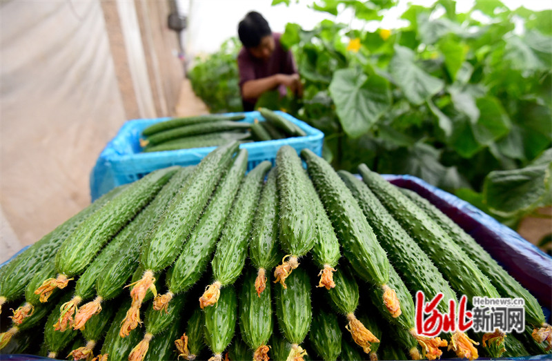 10月13日,館陶縣翟莊村村民在大棚內采摘黃瓜。
