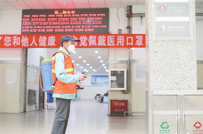 日前,為做好疫情防控工作,確保春運安全有序,河北衡水火車站進一步加強疫情常態(tài)化防控措施,嚴格旅客進出站檢測查驗,加大加密車站公共區(qū)域預防性消毒力度和頻次,建立突發(fā)情況應對機制,落實車站職工健康管理和疫情防控措施,全力做好疫情防控和鐵路運輸安全工作。圖為衡水火車站有關人員正在對候車室進行全面消殺。袁占 、陳康攝影報道