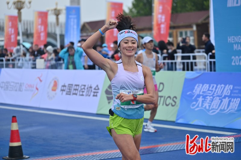2023衡水湖馬拉松賽暨全國(guó)馬拉松錦標(biāo)賽(第三站)上,參賽選手通過(guò)終點(diǎn)時(shí)興奮地舉手歡呼。河北日?qǐng)?bào)記者焦磊攝