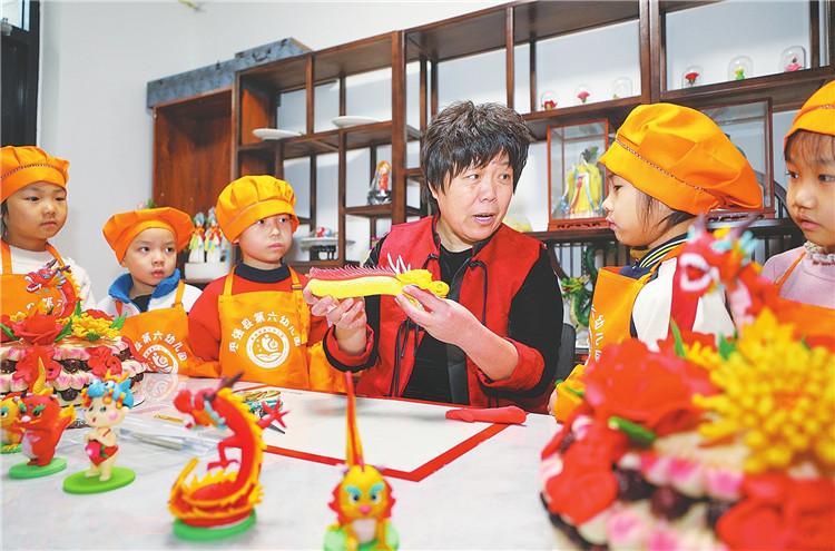 揉、搓、捏、刻、點(diǎn)……春節(jié)前夕,在棗強(qiáng)縣會(huì)青面塑藝術(shù)館內(nèi),非遺傳承人李會(huì)青正專心創(chuàng)作生動(dòng)有趣的祥龍面塑作品,一群幼兒園的孩子們圍著她學(xué)習(xí)面塑手藝,感受面塑的獨(dú)特魅力。陳康攝