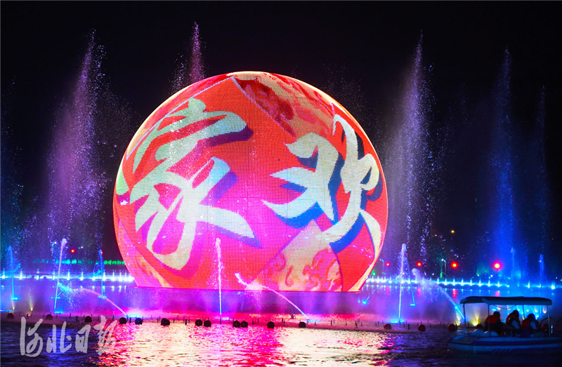 2021年5月22日晚拍攝的河北省廊坊市安次區(qū)的御龍河公園。在公園的濱水游樂(lè)區(qū),直徑16米、高12米,由11萬(wàn)個(gè)LED像素點(diǎn)構(gòu)成的水上巨型球幕,配合氣霧森林、音樂(lè)噴泉,上演大型燈光秀,為市民帶來(lái)別樣的視聽(tīng)感受。河北日?qǐng)?bào)記者趙永輝攝影報(bào)道
