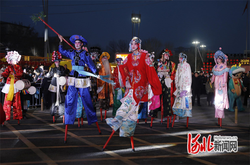 2月2日,在固安縣永定河文化大廟會(huì)開(kāi)街現(xiàn)場(chǎng),演員在表演高蹺。通訊員肖靖凱攝