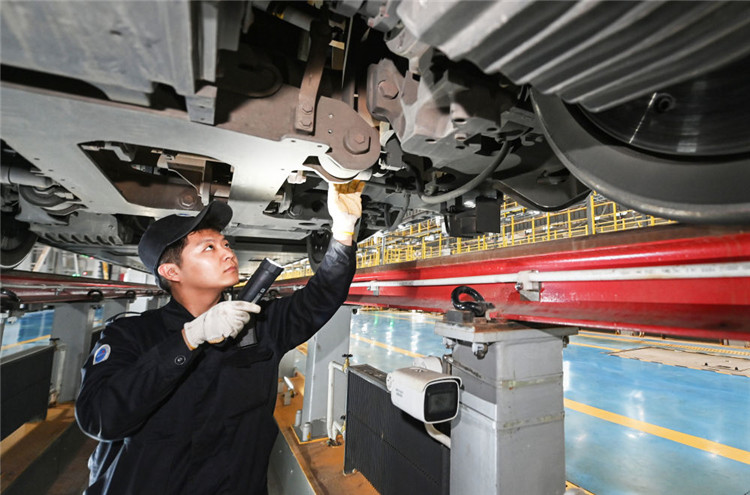 動(dòng)車機(jī)械師站在檢修地溝中查看動(dòng)車底部零件狀況。劉向攝