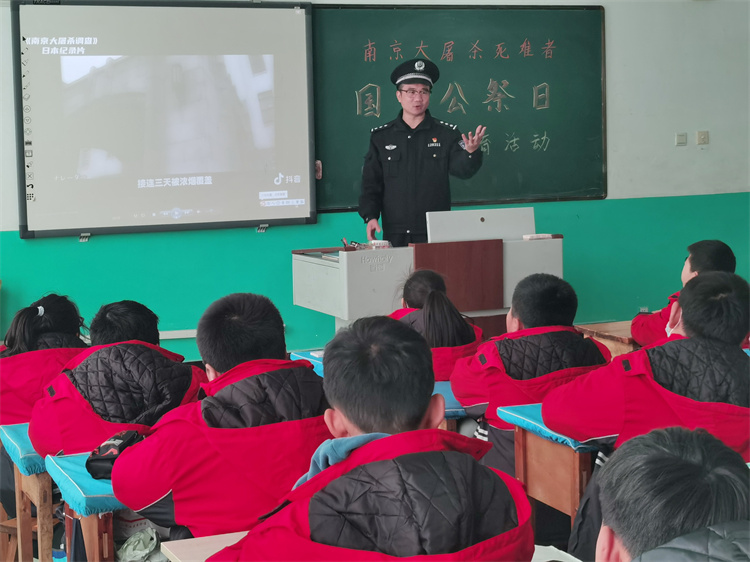 當(dāng)天是南京大屠殺死難者公祭日,教室里,民警向?qū)W生們介紹了國家公祭日的由來,播放了《南京大屠殺調(diào)查》紀(jì)錄片節(jié)選片段,使學(xué)生進一步了解到南京大屠殺的歷史背景、事件始末,教育引導(dǎo)廣大學(xué)生不忘民族苦難,牢記歷史悲劇,樹立正確理想信念,弘揚民族斗爭精神,勤奮學(xué)習(xí),刻苦鉆研,為祖國的繁榮富強而奮發(fā)進取。
