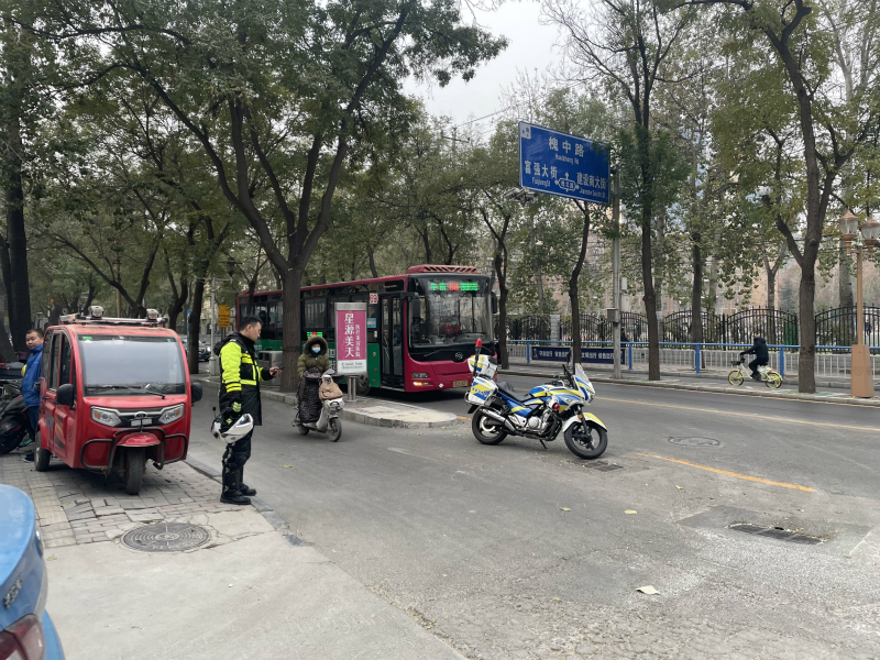 執(zhí)勤交警在現(xiàn)場(chǎng)整治違停,保障道路暢通。