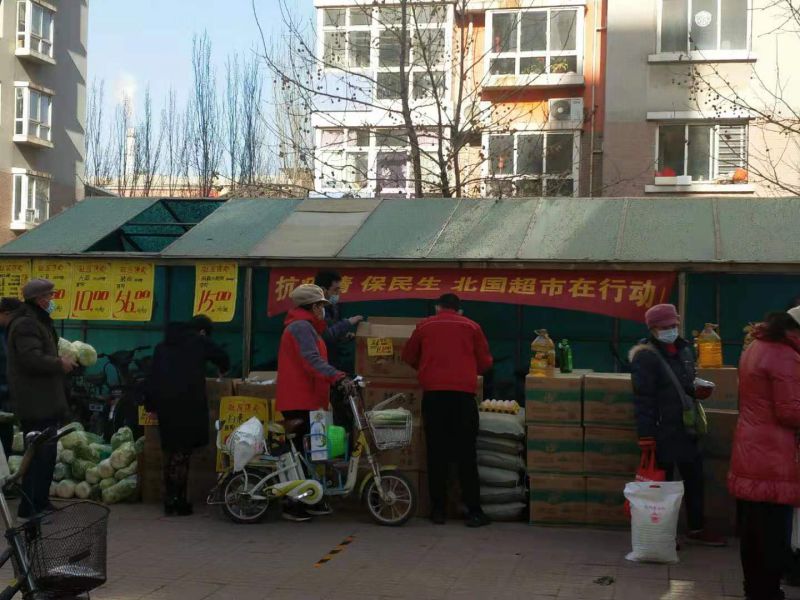 圖為躍進(jìn)街道和華社區(qū)依水苑小區(qū),北國(guó)超市正在售賣(mài)果蔬,居民有序買(mǎi)菜、保持距離。