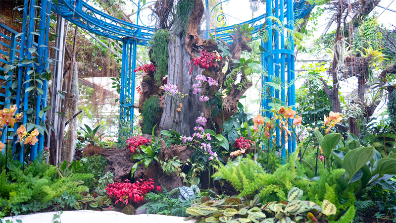 百花館內(nèi),園藝師采用石斛蘭、空氣鳳梨、積水鳳梨、各種蕨類等50余種植物附生在枯木與沉木之中,與屋頂?shù)呐谡袒、垂下的錦屏藤相互交織,讓您有一種身處熱帶雨林的感覺。各種爬藤類植物與競(jìng)相綻放的蝴蝶蘭交相輝映。步入其中,一股暖意隨著眼前絢爛多姿,高低錯(cuò)落的花海溫潤(rùn)襲來(lái),讓人忍不住放慢腳步,駐足欣賞。