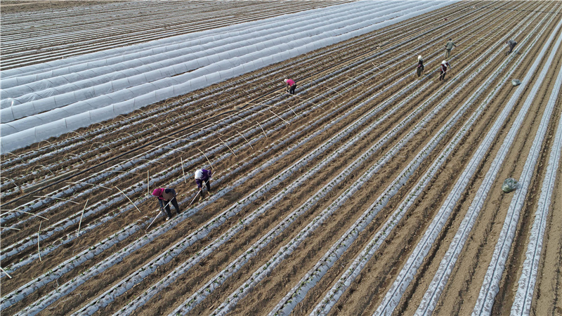 4月6日,唐山市灤南縣東黃坨鎮(zhèn)新戶村農(nóng)民采用雙層覆膜技術(shù)種植紅薯(無人機(jī)照片)。