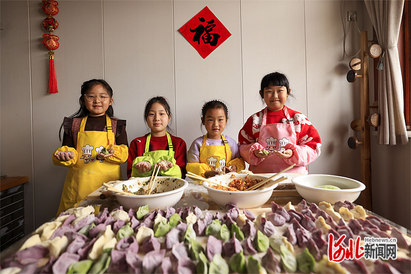 唐山市豐南區(qū)胥各莊鎮(zhèn)蠻子坨村小朋友在包餃子。