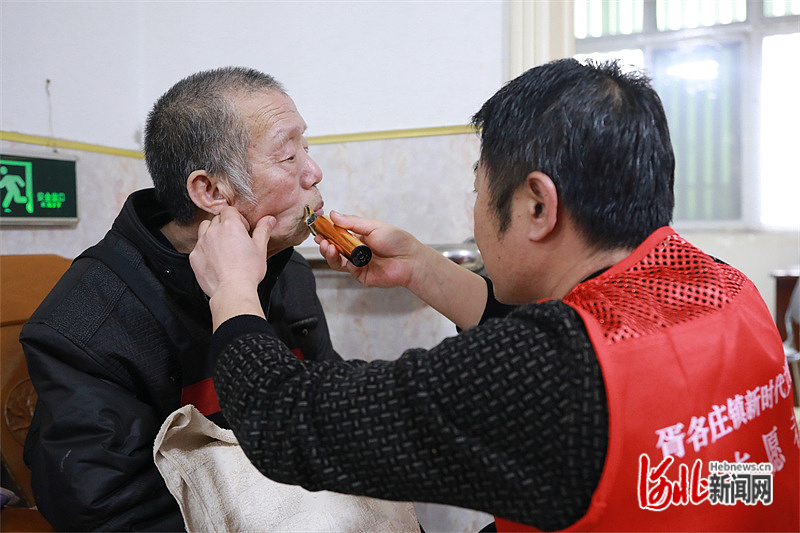 3月4日,唐山市豐南區(qū)胥各莊鎮(zhèn)的志愿者為慈恩養(yǎng)老院的老人剃胡須。