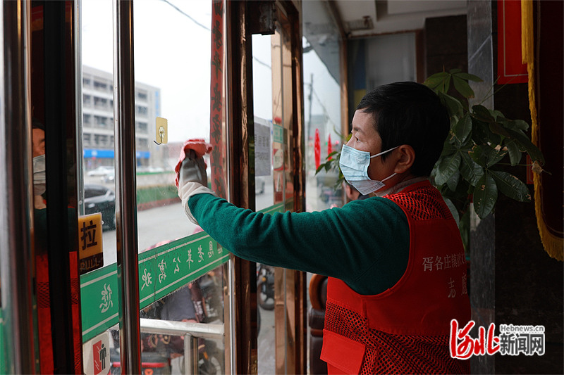 3月4日,唐山市豐南區(qū)胥各莊鎮(zhèn)的志愿者在慈恩養(yǎng)老院擦玻璃。