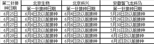 6月30日以后根據(jù)國家和省統(tǒng)一部署,將重點(diǎn)開展其他人群的接種,不再組織集中接種第二劑次新冠疫苗。到6月30日我市每天需接種近20萬人,為避免人員累積,造成接種擁擠,第一劑次接種北京生物、北京生物(長春灌裝)、科興中維疫苗滿21天、接種安徽智飛龍科馬疫苗滿28天的居民,按照以下《接種時(shí)間對照表》盡快接種第二劑次。