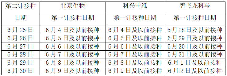 自6月10日-30日期間,在全市范圍內(nèi)集中開展新冠病毒疫苗第二劑次接種活動,此次活動已接近尾聲。7月1日起,根據(jù)國家和省統(tǒng)一安排,將不再組織集中接種第二劑次新冠疫苗。請接種第一劑次滅活新冠疫苗滿21天和接種第一劑次重組新冠疫苗滿28天的市民朋友們,盡快到就近接種點(diǎn)接種第二劑次新冠疫苗。如果您還不清楚自己接種第二劑次疫苗的時(shí)間,請參照下表作出安排。