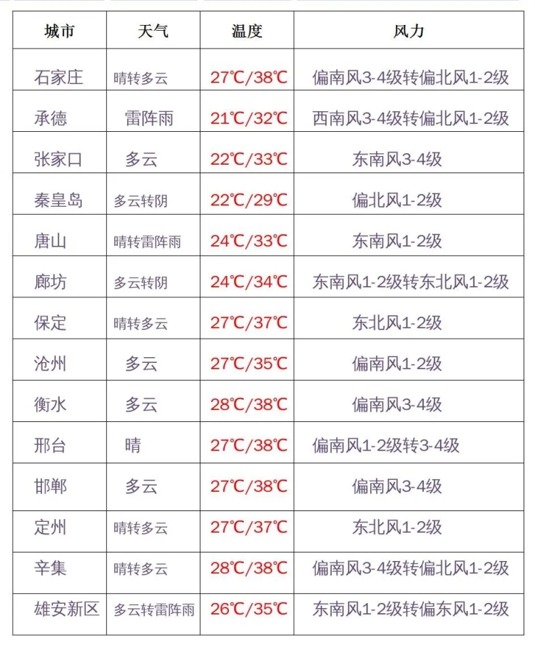 預(yù)計(jì)今天下午,保定南部、雄安新區(qū)、石家莊、滄州、衡水、邢臺(tái)、邯鄲最高氣溫為35~37℃,局地可達(dá)38~39℃。