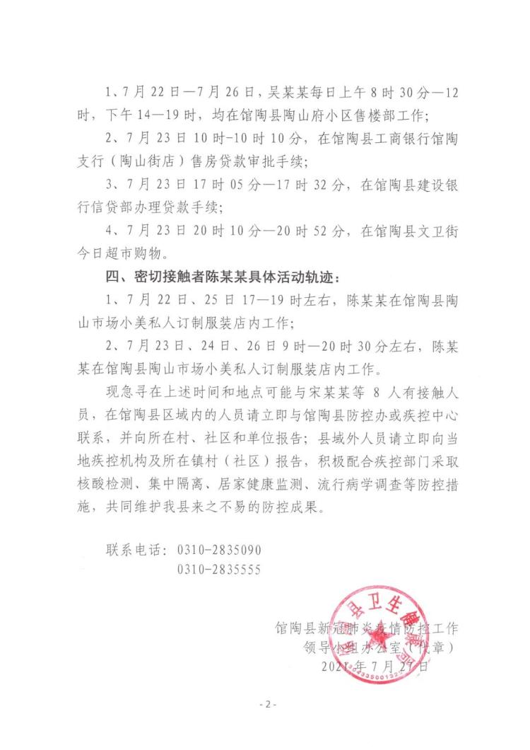 現(xiàn)急尋在上述時間和地點可能與宋某某等8人有接觸人員,在館陶縣區(qū)域內(nèi)的人員請立即與館陶縣防控辦或疾控中心聯(lián)系,并向所在村、社區(qū)和單位報告;縣域外人員請立即向當?shù)丶部貦C構(gòu)及所在鎮(zhèn)村(社區(qū))報告,積極配合疾控部門采取核酸檢測、集中隔離、居家健康監(jiān)測、流行病學調(diào)查等防控措施,共同維護我縣來之不易的防控成果。聯(lián)系電話:0310-2835090;0310-2835555。