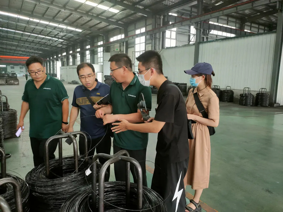 青龍劍釘業(yè)總經(jīng)理馬群澤(中)介紹制釘?shù)墓に嚵鞒?/p>