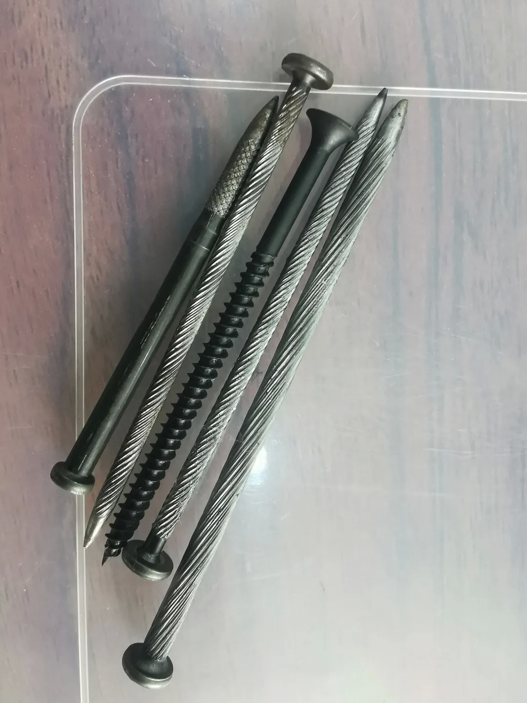 馬群澤:這是我們第一代的釘子,你看它后邊粗前頭細(xì),跟子彈似的。前頭我們?yōu)榱嗽黾幽Σ亮,我們又增加了滾花的工藝,耐磨性、拉拔力更強(qiáng)。咱們的產(chǎn)品穩(wěn)定性很強(qiáng),像建筑上用鋼釘,釘鋼管把圓鋼管固定下來,用這個(gè)一盒里成功率最起碼在99%以上。
