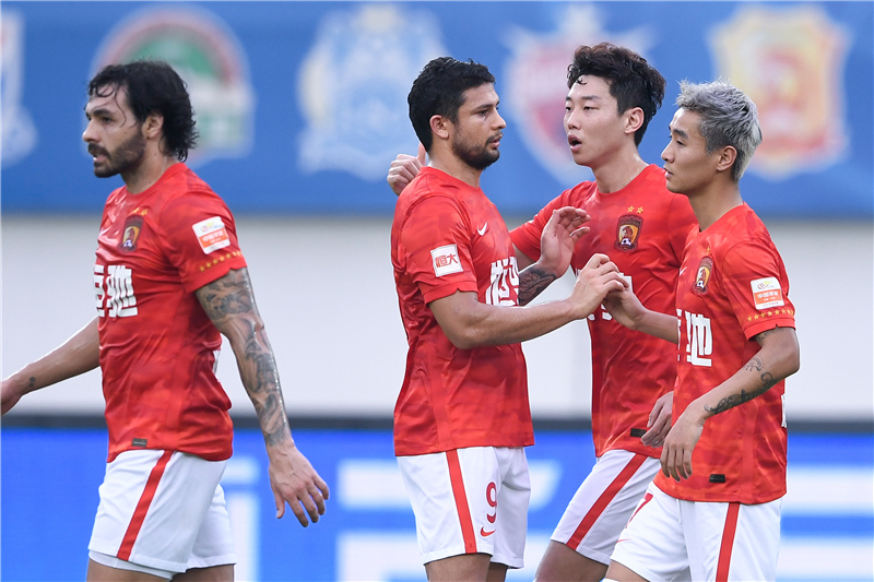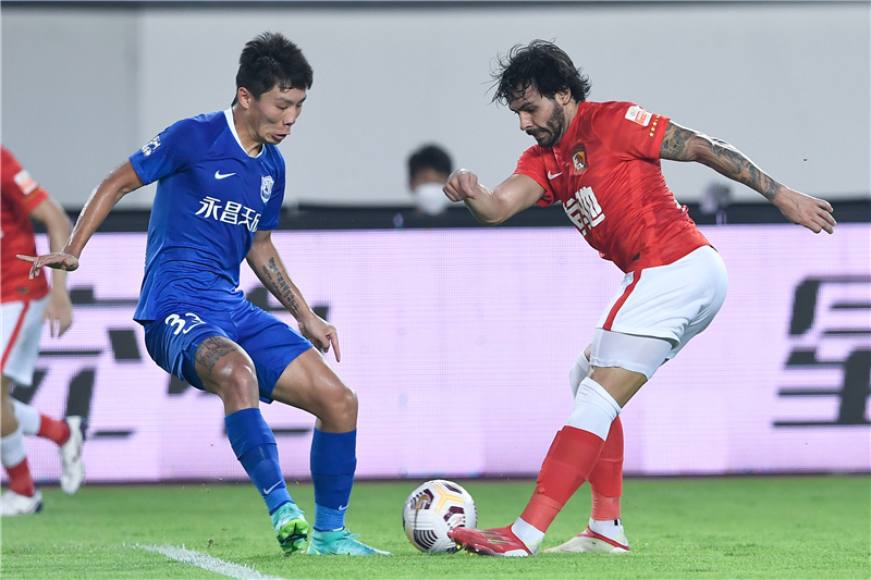 當日,在2021賽季中國足球協(xié)會超級聯(lián)賽(廣州賽區(qū))第11輪比賽中,廣州隊以5比2戰(zhàn)勝滄州雄獅隊。新華社發(fā)