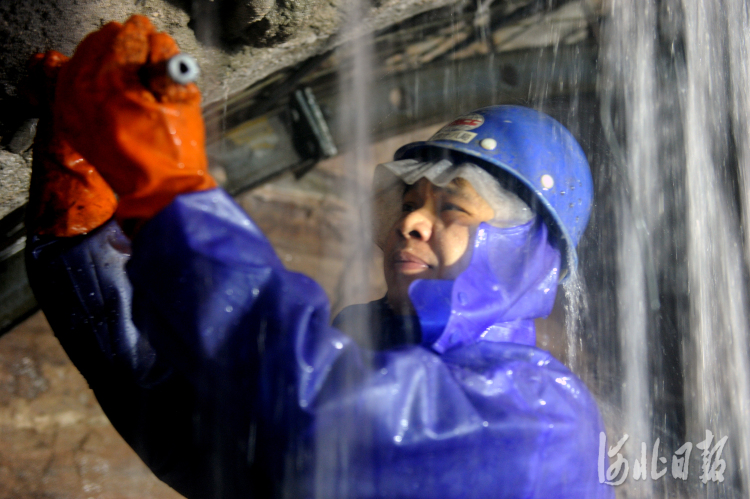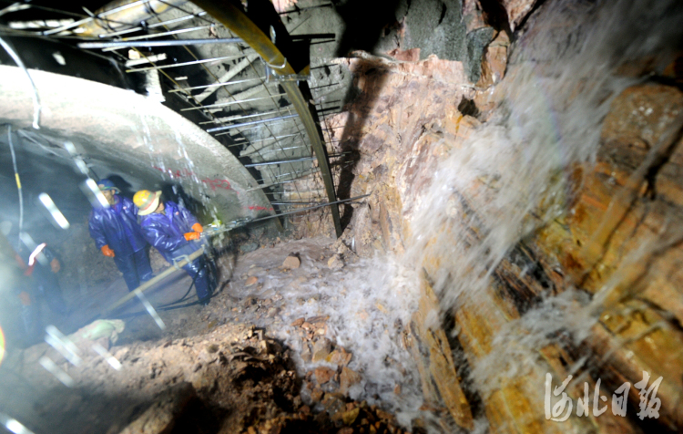 天河山隧道內(nèi)巖層水流如注,猶如水簾洞,絲毫沒(méi)有影響施工人員 。河北日?qǐng)?bào)記者杜柏樺攝影報(bào)道