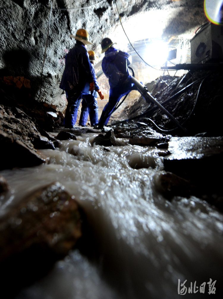 天河山隧道里涌水涌泥成河,打風(fēng)鉆施工人員雙腳就浸泡在水里。河北日?qǐng)?bào)記者杜柏樺攝影報(bào)道