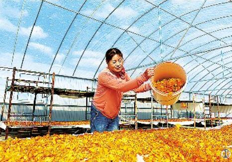 李季梅在大棚內(nèi)晾曬金蓮花。河北日報(bào)記者張昊攝