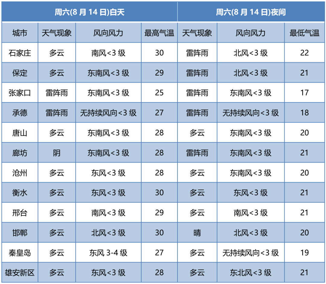 13日夜間到14日,張家口、承德、唐山、秦皇島、廊坊北部、保定西部、石家莊西北部陰有雷陣雨或陣雨,局地有中雨,其他地區(qū)多云。