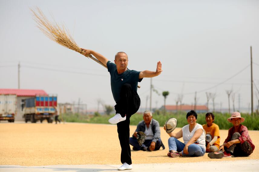 6月11日,河北省滄州市新華區(qū)小趙莊鄉(xiāng)孫莊子村村民韓福升(左一)在曬麥場用農(nóng)具掃帚表演“春秋大刀”。