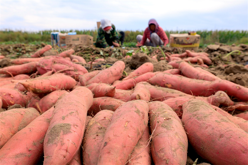 9月15日,唐山市豐南區(qū)大齊各莊鎮(zhèn)井屯村農(nóng)民在田間收獲紅薯。