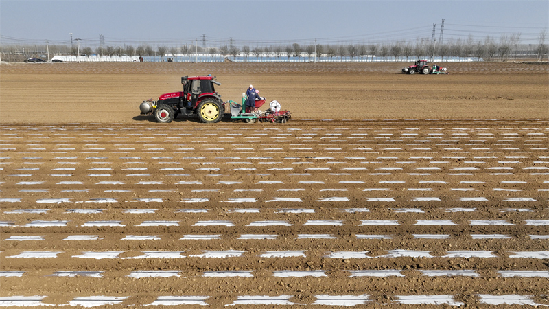 3月16日,在河北省唐山市豐潤區(qū)小張各莊鎮(zhèn)南坨村,農(nóng)民駕駛農(nóng)機(jī)翻耕土地準(zhǔn)備播種地膜玉米(無人機(jī)照片)。