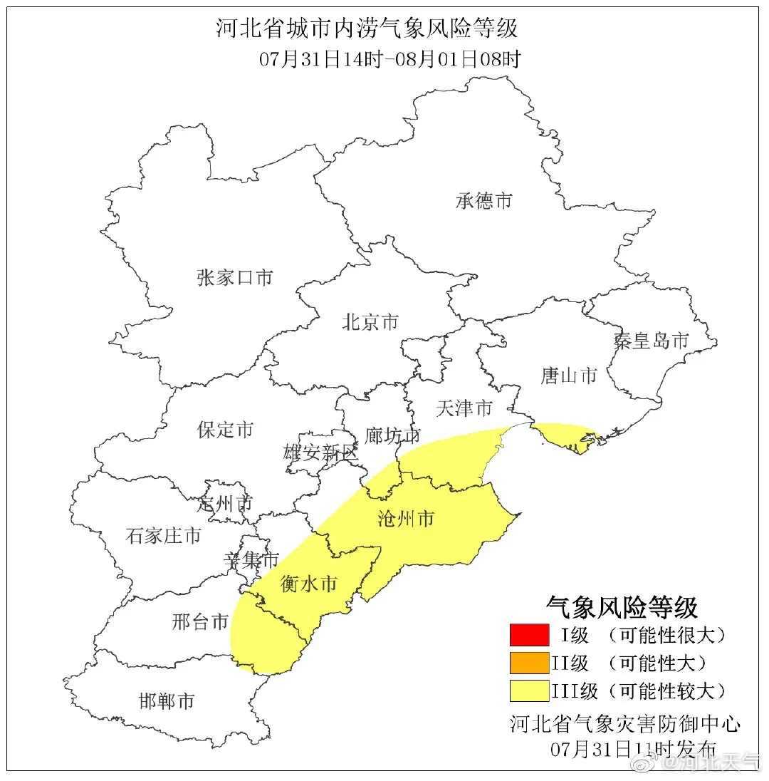 河北省氣象災(zāi)害防御中心2021年07月31日11時發(fā)布城市內(nèi)澇氣象風(fēng)險等級預(yù)報: