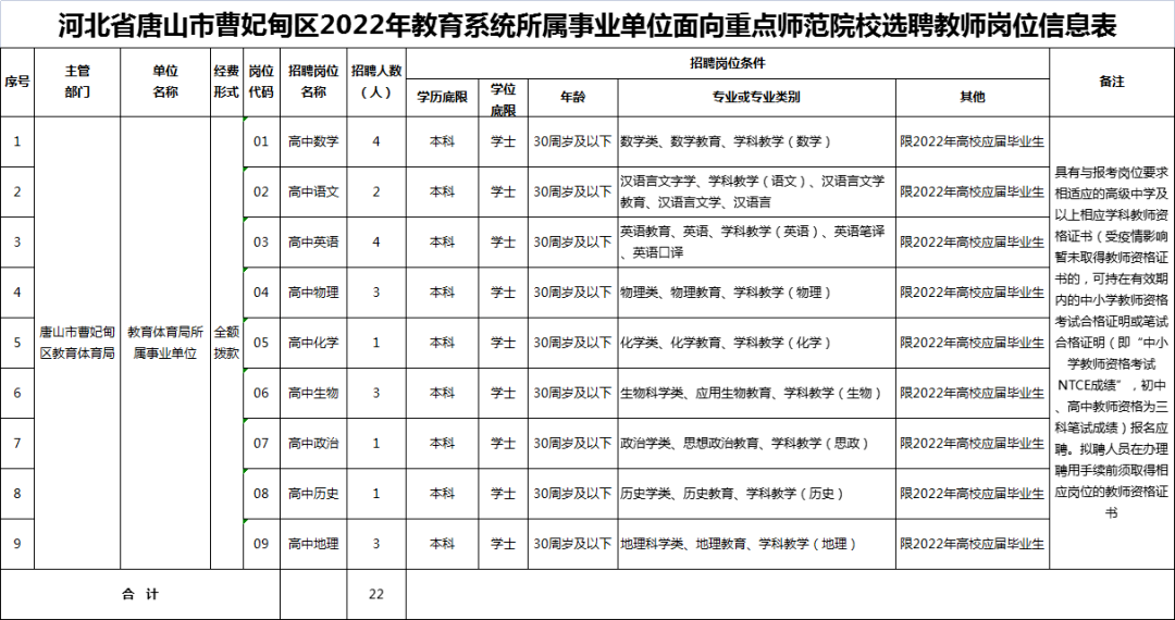 唐山市曹妃甸區(qū)2022年教育系統(tǒng)所屬事業(yè)單位面向重點(diǎn)師范院校選聘事業(yè)編制教師。本次選聘事業(yè)編制教師共22名,具體選聘人數(shù)和崗位條件詳見《河北省唐山市曹妃甸區(qū)2022年教育系統(tǒng)所屬事業(yè)單位面向重點(diǎn)師范院校選聘教師崗位信息表》(附件1)。各學(xué)科教師招聘數(shù)額根據(jù)報名實(shí)際情況可做適當(dāng)調(diào)劑。