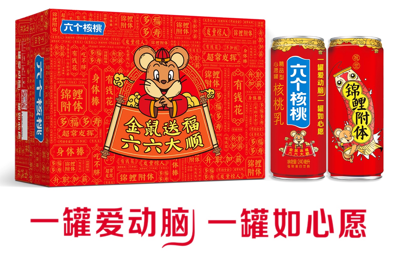 2016年3月,《中國(guó)食品學(xué)報(bào)》發(fā)表了“國(guó)內(nèi)首個(gè)關(guān)于核桃產(chǎn)品改善記憶的人群試食試驗(yàn)”,明確了核桃植物蛋白飲料具有一定改善記憶的功能,長(zhǎng)期飲用核桃乳對(duì)人體大腦能夠起到非常積極的意義。因此,大腦宕機(jī)不怕囧,“一罐六個(gè)核桃,強(qiáng)腦破囧,智慧開年”!