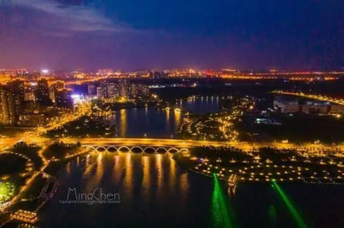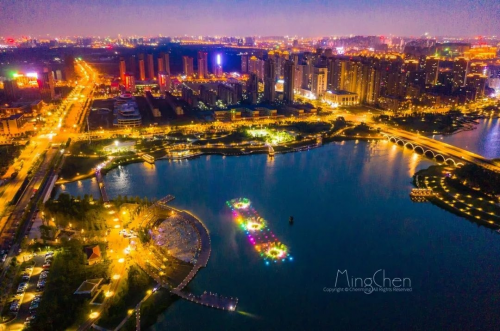 用航拍小飛機升空后,俯瞰和睦湖全景。夕陽西下,遠處高樓燈光和街道照明連接成片,一副現(xiàn)代化都市夜景面貌表露無遺。