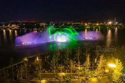 和睦湖音樂噴泉名為“水舞傾城”,長約120米,寬約18米,最高水柱達100米以上,成為網(wǎng)紅景點。以水秀、水幕電影為媒介,設計主題為“和諧發(fā)展百花齊放”,結(jié)合聲、光、電、火,將人與水、人與火、人與樂融為一體,綻放浪漫、綻放激情。
