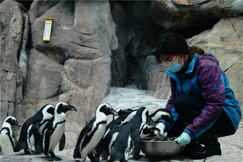 5月19日,上海動物園飼養(yǎng)員給斑嘴環(huán)企鵝喂食。