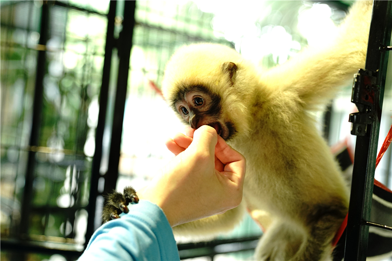 5月19日,在上海動物園靈長類育嬰房,飼養(yǎng)員喂長臂猿寶寶吃東西。