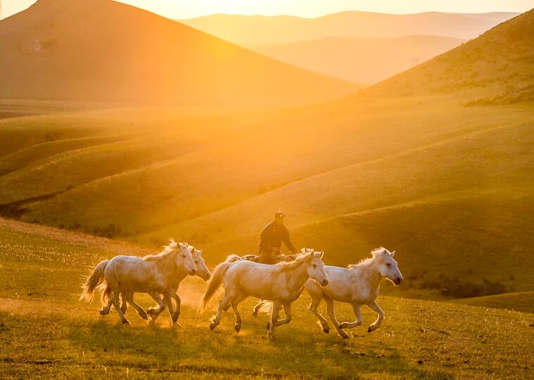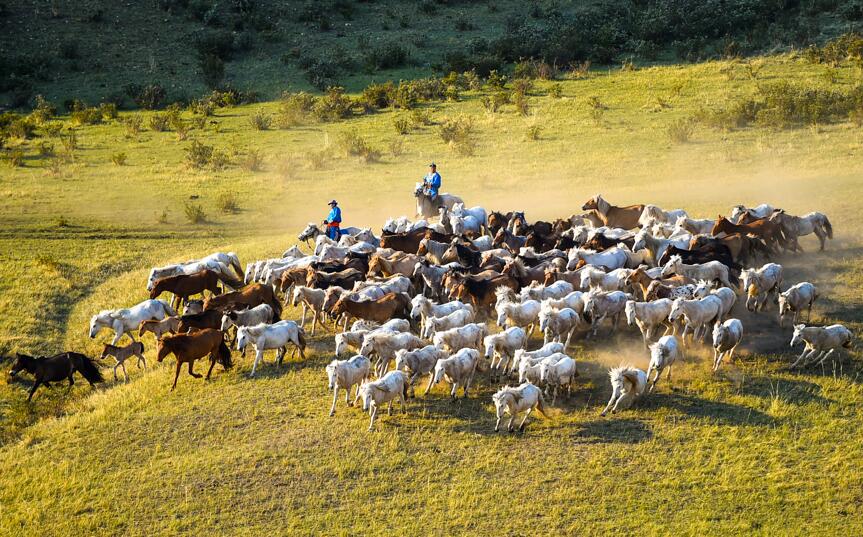 5月17日,錫林郭勒盟西烏珠穆沁旗的牧民在夕陽下馴馬。