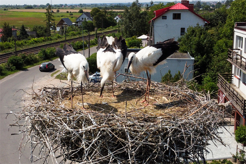 這是7月18日在波蘭西部一個(gè)村莊拍攝的白鸛(無(wú)人機(jī)照片)。新華社/歐新