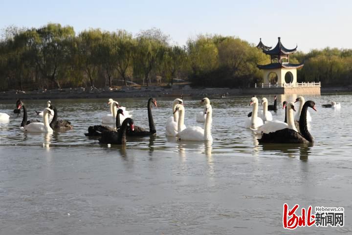 11月30日,天鵝在廣平縣天鵝湖湖面結(jié)伴嬉戲。