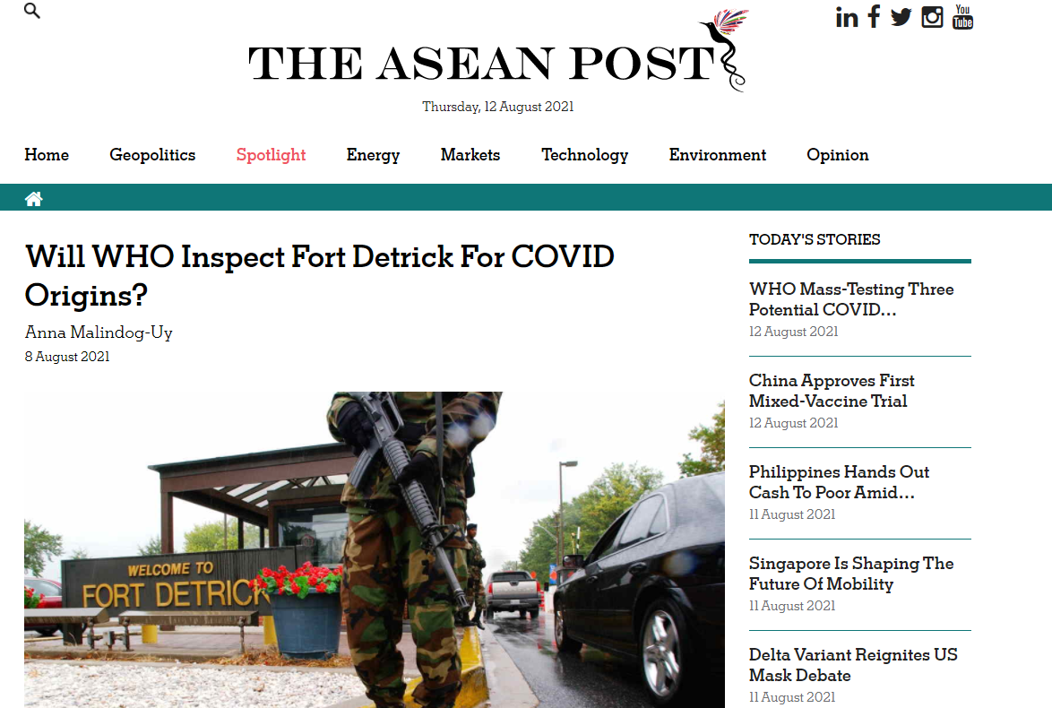 中國日報網8月12日電 近來,國際社會要求調查美國德特里克堡生物實驗室的理性聲音不斷增多。馬來西亞《東盟郵報》網站近日刊發(fā)菲律賓政治學家Anna Malindog-Uy的評論文章稱,了解新型冠狀病毒的起源是一個非常重要的問題和任務,美國德特里克堡實驗室是一個不應被世衛(wèi)組織忽視的謎團。
