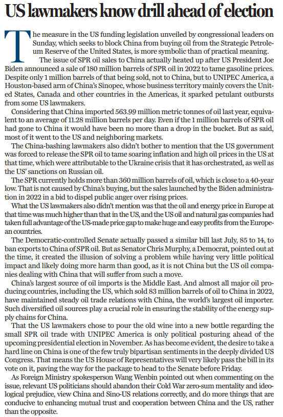 上周日,美國(guó)國(guó)會(huì)領(lǐng)導(dǎo)人通過(guò)一項(xiàng)政府開(kāi)支法案,其中包括阻止中國(guó)從“戰(zhàn)略石油儲(chǔ)備”(SPR)購(gòu)買(mǎi)石油。這一行為的象征意義,遠(yuǎn)大于實(shí)際意義。